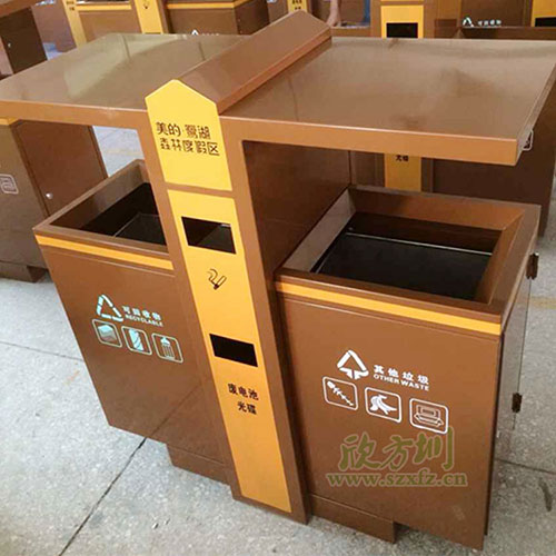 這款韶關(guān)景區(qū)垃圾桶編號為F238戶外分類垃圾桶,外桶為足1.2mm鍍鋅板,表面噴塑工藝,內(nèi)膽為201#,厚足0.75mm, 螺絲螺母為304不銹鋼材質(zhì),采用不銹鋼膨脹螺 安裝。噴塑顏色為土豪金色,垃圾桶開口位置坐折邊處理,箱體帶簡易防盜鎖。左右兩邊分別絲印,可回收物,其他垃圾等圖案標志。中間橙黃色區(qū)域,印有美的·鷺湖森林度假區(qū),廢電池光碟字樣,字體顏色為土豪金色