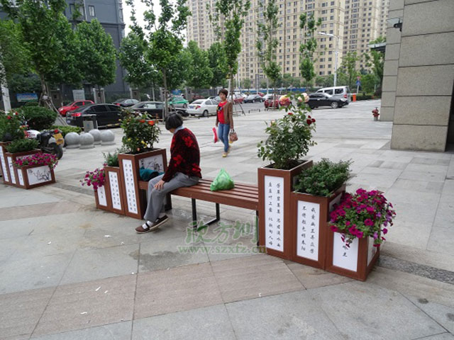 欣方圳市政塑木花箱最大的優(yōu)點就是在美化了環(huán)境的同時,還增加了其使用年限,有限的防止了浪費木材,側(cè)面的等于對環(huán)境做出了貢獻。另外欣方圳的塑木花箱有限的防止了蟲蟻等的破壞,很多孩子容易被美麗的鮮花所吸引,會離花箱很近,但普通實木花箱時間久,會被腐蝕,里面有很多螞蟻,蟲子,很不衛(wèi)生,而塑木花箱能有效的防止這一缺憾。還能夠滿足客戶對各種規(guī)格、尺寸、形狀、厚度的需求,同時也可提供多種設(shè)計、顏色及木紋。還具有與原木相同的加工性能,可釘、可鉆、可切割、粘接,用釘子或螺栓連接固定,表面光滑細膩、無需砂光和油漆。而其油漆附著性好,亦可根據(jù)個人喜好上漆。就例如圖上這款花箱上面還能應(yīng)客戶要求描繪中國魅力的風(fēng)格。