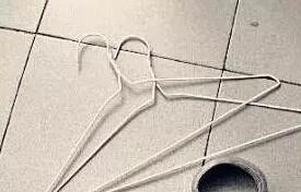 3、將兩個窩好的衣架疊在一起,兩個掛鉤朝同一側(cè),但是掛鉤之間要離開一些,這是為把垃圾桶掛起來更方便、更牢固。