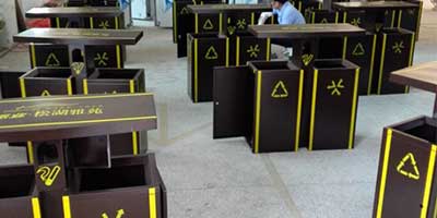 欣方圳鋼制戶外四分類垃圾桶產(chǎn)品一律用室外粉靜電噴塑,經(jīng)過180°的高溫