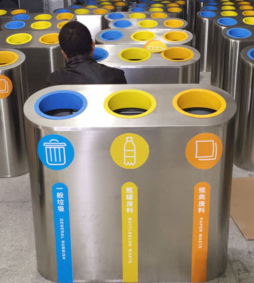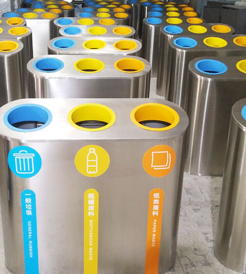 地鐵不銹鋼三分類垃圾桶整體橢圓設(shè)計,避免不經(jīng)意的磕碰對人身造成傷害,黃橙藍三色分類投口與桶身分類標(biāo)識顏色一致,有助于從源頭精準(zhǔn)垃圾分類投放。