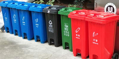 120/240升塑料垃圾桶藍(lán)色、灰色、綠色、紅色4種不同顏色組合擺放分別用于城市環(huán)衛(wèi)收集可回收物、其他垃圾、廚余垃圾、有害垃圾分類收集。