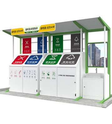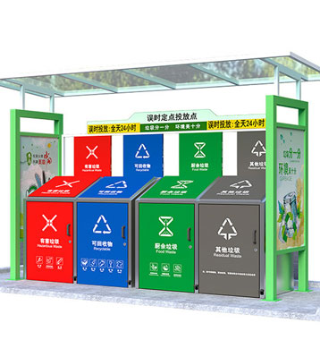 設(shè)有擋雨棚,可配備垃圾箱信息顯示屏、防水照明燈、廣告屏,進(jìn)行地面硬化。對社區(qū)玻金塑紙可回收物,其他垃圾,廚余垃圾,有害垃圾等生活垃圾定時定點投放收集.