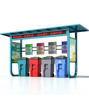 設(shè)有擋雨棚,可配備垃圾箱信息顯示屏、防水照明燈、廣告屏,進行地面硬化。對社區(qū)玻金塑紙可回收物,其他垃圾,廚余垃圾,有害垃圾等生活垃圾定時定點投放收集.