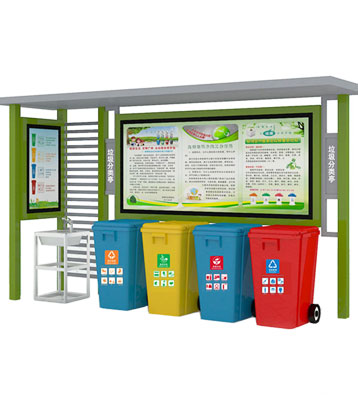 設(shè)有擋雨棚,可配備垃圾箱信息顯示屏、防水照明燈、廣告屏,進行地面硬化。對社區(qū)玻金塑紙可回收物,其他垃圾,廚余垃圾,有害垃圾等生活垃圾定時定點投放收集.
